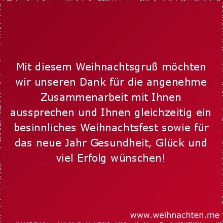 Weihnachtsgrüße für Kunden und Geschäftsfreunde, verbunden mit den besten Wünschen für das kommende Jahr, sind mehr als eine schöne Tradition. Geschäftliche Weihnachtsgrüße sind vor allem ein Zeichen der Wertschätzung für die Menschen, mit denen Du auch in Zukunft geschäftlich verbunden sein möchtest. Mit einer persönlichen Weihnachtskarte, vielleicht auch einem schönen Präsent, rufst Du dich zum Jahresende bei Deinen Geschäftspartnern freundlich in Erinnerung und legst die Grundlagen für eine gute Zusammenarbeit im neuen Jahr. Anregungen für geschäftliche Weihnachtsgrüße findest Du hier. Bestimmt ist auch für Dich ein passender Weihnachtsspruch dabei.